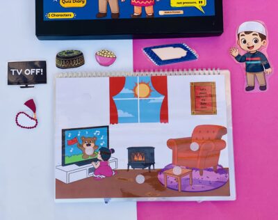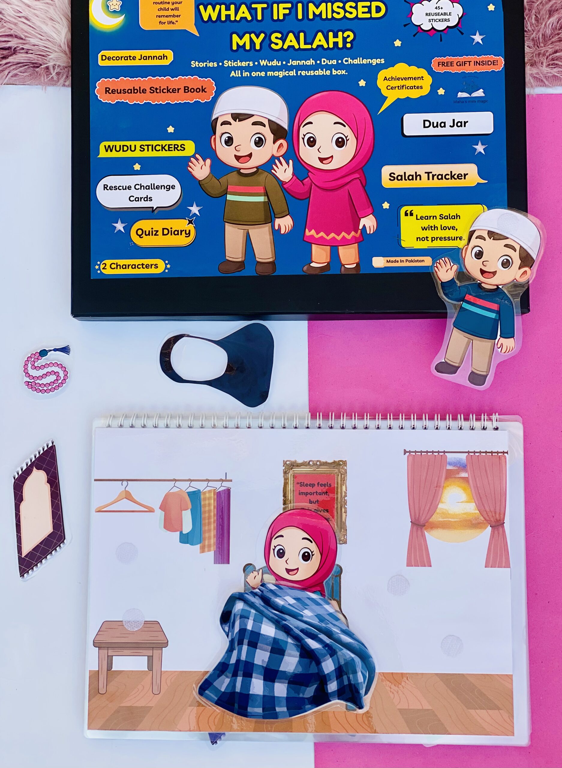 Our binder is different because kids don’t just watch the story — they play it. In Fajar scene, they can choose: blanket sticker to sleep or jayenamaz sticker to pray, plus scarf and cap to get ready. Every scene has small different options like this. This way kids learn Salah through fun choices, not pressure.