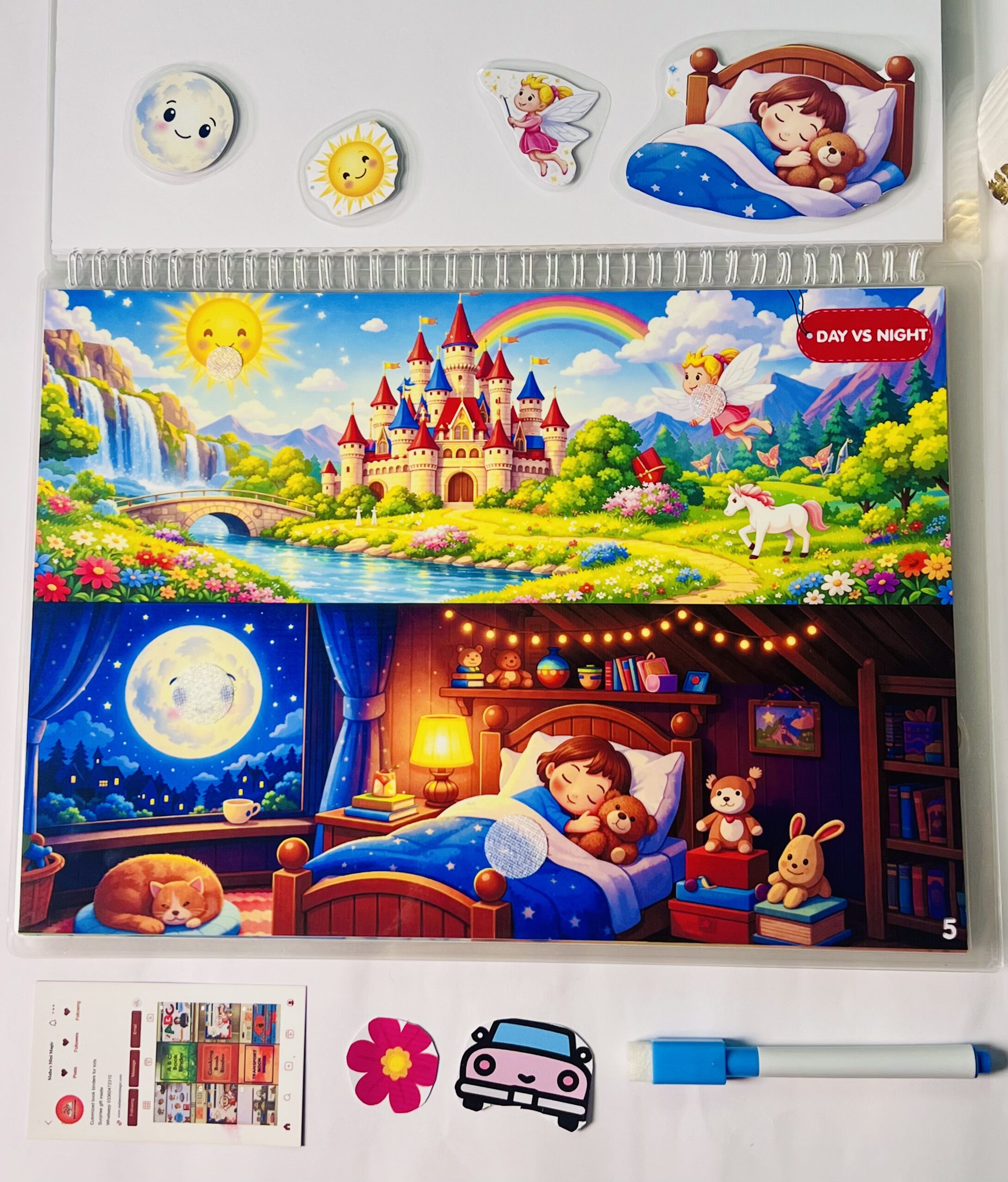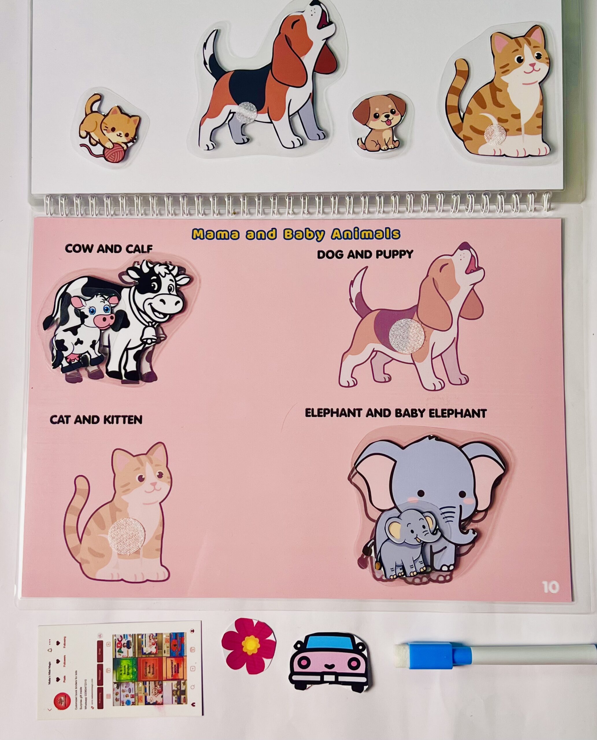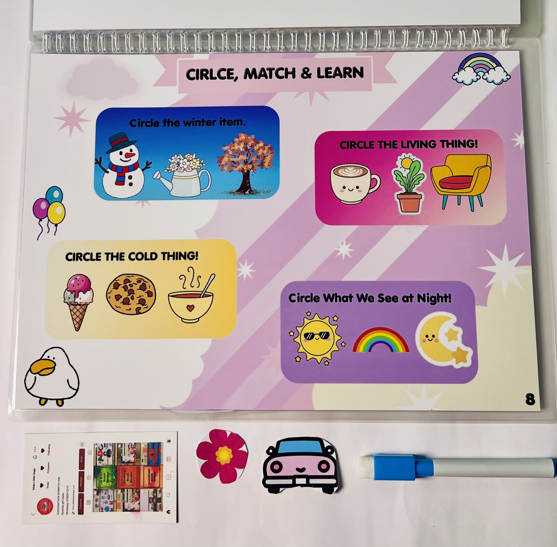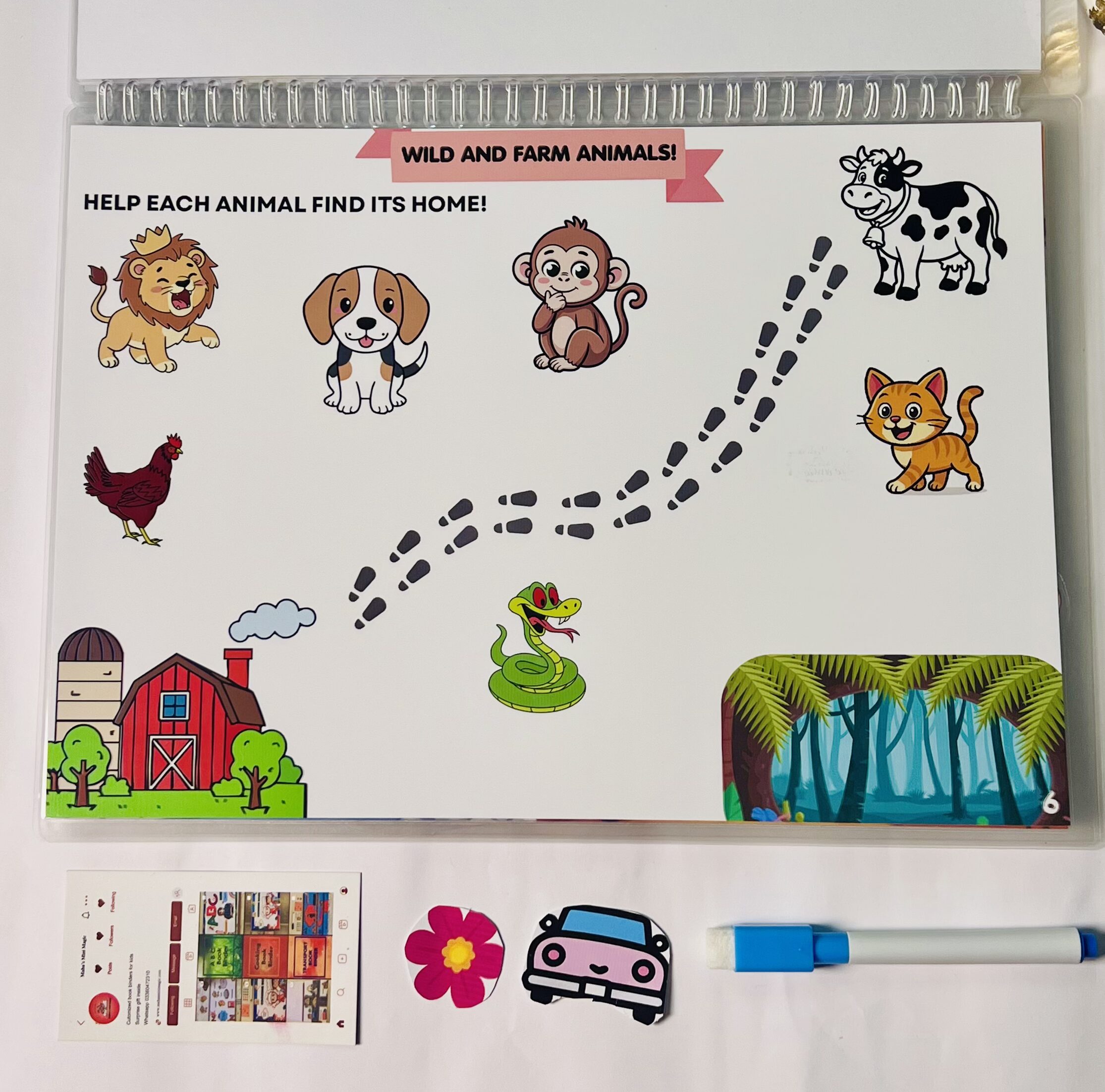 Laminated pages with markers allow kids to learn, erase, and play again and again.